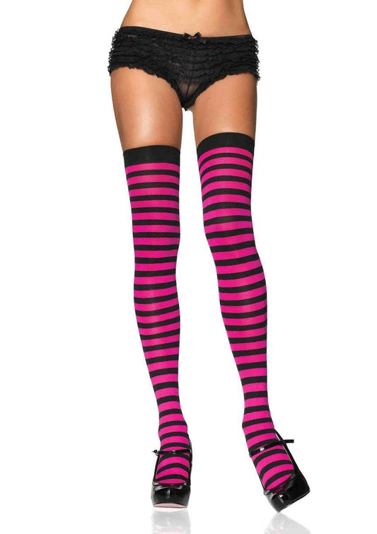 Striped Nylon Thigh Highs - Black/Fuchsia