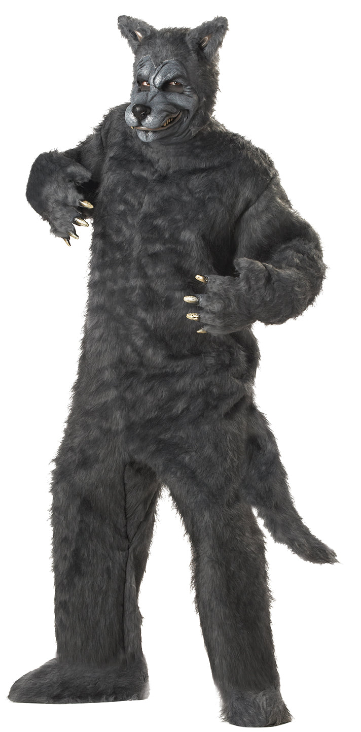 Howling at more than just the moon. The Big Bad Wolf costume includes faux fur body suit with attached tail, mask, hands, shoe covers.