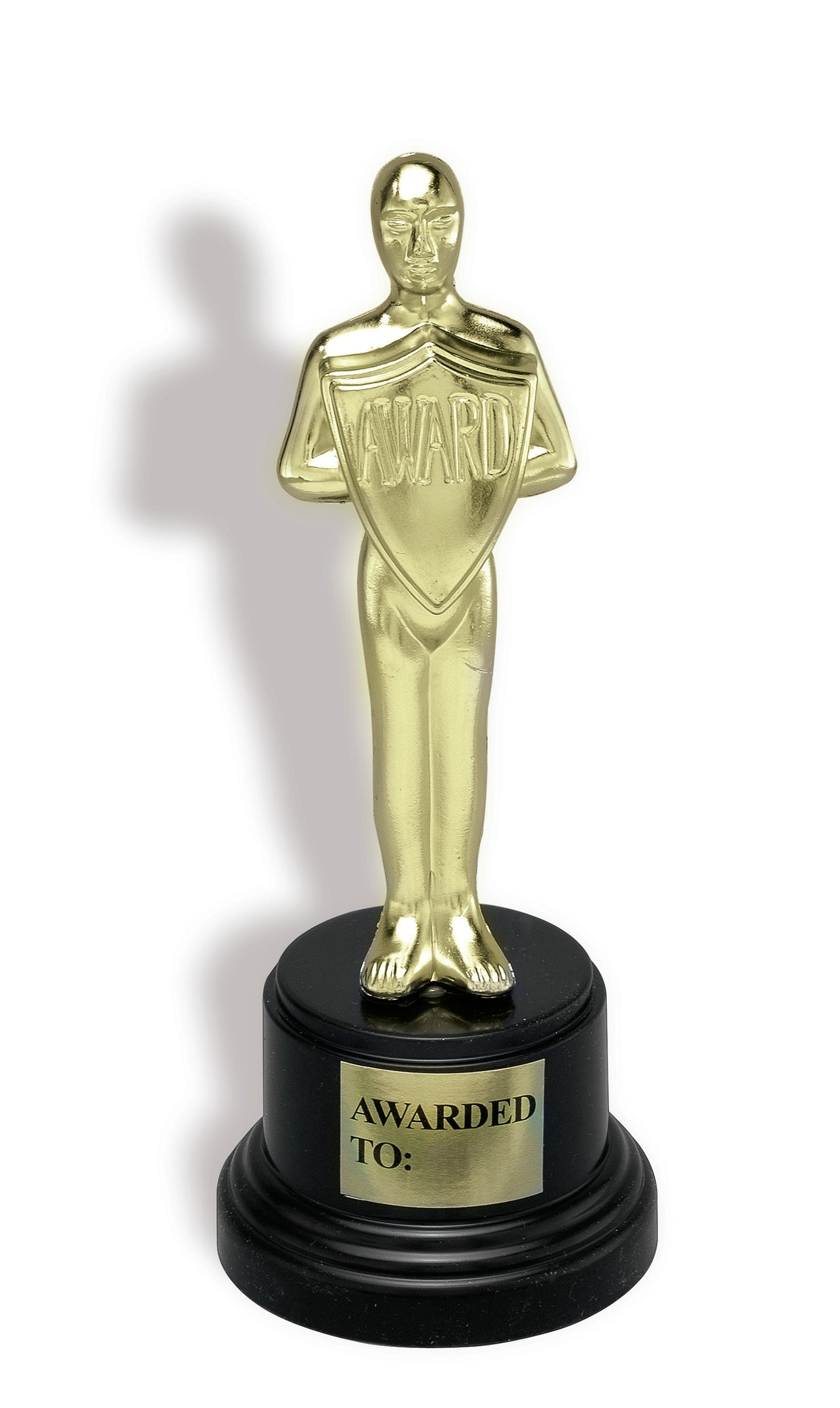 And the award goes to.... you! Don't just look the best this Halloween, prove you ARE the best with a trophy to signify that achievement! Whether you're dressing up like a Hollywood actor, an Olympic athlete, or just winning an award for Best Costume, show everyone that you bring home the gold! This trophy stands nine inches tall and looks like a little gold man holding a shield on the stand! The stand has the words"Awarded to:" written on it!