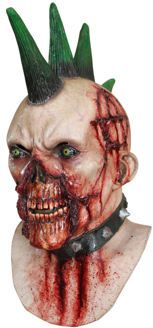 Sure, we know all the classics, like vampires, werewolves, zombies, skeletons... But what about the terrifying nightmares of Halloween that don't fit into a box? What about the creatures that are just plain scary, like this terrifying Latex Billy Punk Mask from Ghoulish Productions? This awesome, undead punk rocker is expertly molded with an exposed lower skull, missing his nose and mouth so that you can see all of his teeth snarling at you, scary black and yellow eyes, and an Anarchy symbol carved into the side of his head. And, of course, no punk would be complete without his liberty spike mohawk, which is molded on top of his head in awesome green and black. Great for a zombie costume. Punk is dead, long live punk!