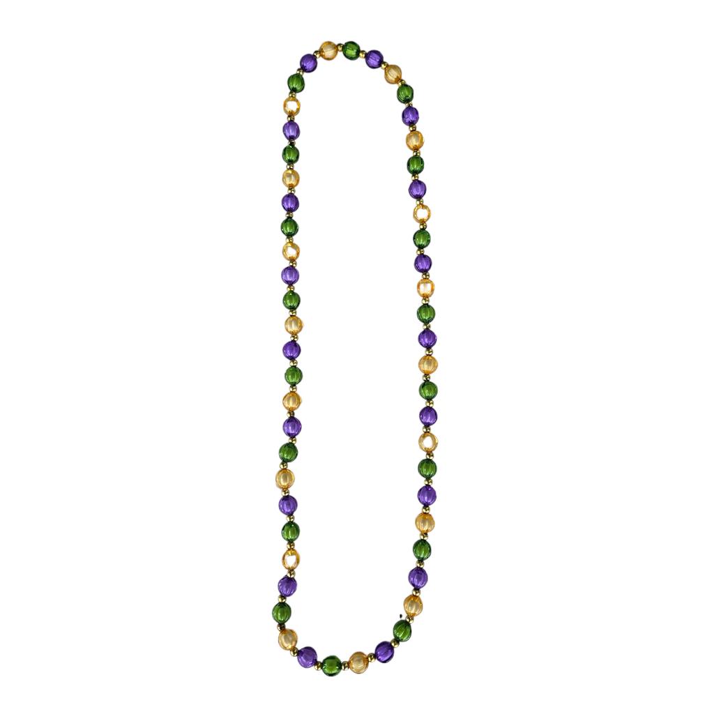 "Add some sparkle to your Mardi Gras outfit with our 40" Clear Prism Beads - PGG (14MM). These collector beads are perfect for Saint Louis and New Orleans celebrations, featuring purple, green, and gold for that classic carnival look. Don't forget to accessorize with these fun and festive necklace beads!"