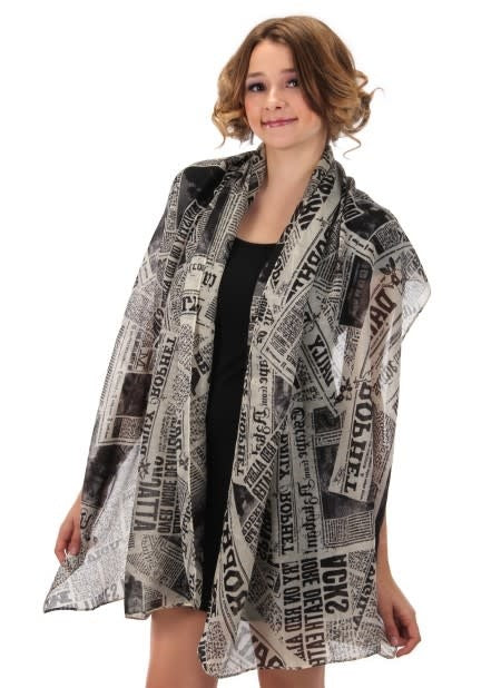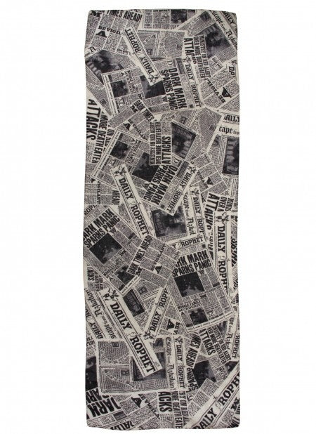 Brush up on your knowledge of magical happenings when you wear this Harry Potter Daily Prophet Newspaper Print Lightweight Scarf by elope.