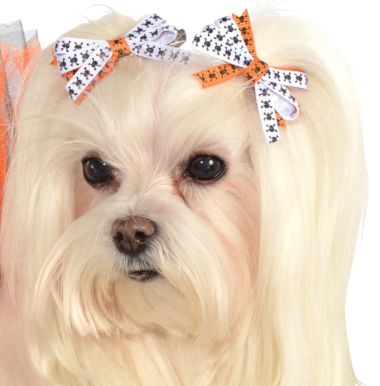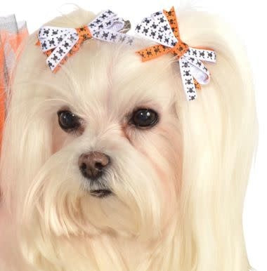 Help your furry family member get into the Halloween spirit with these adorable Halloween Hair Bows from Rubie's Costumes! These super cute bows clip right into your dog's hair on their ears comfortably and look adorable! These orange and white bows are decorated with little skull and crossbones!