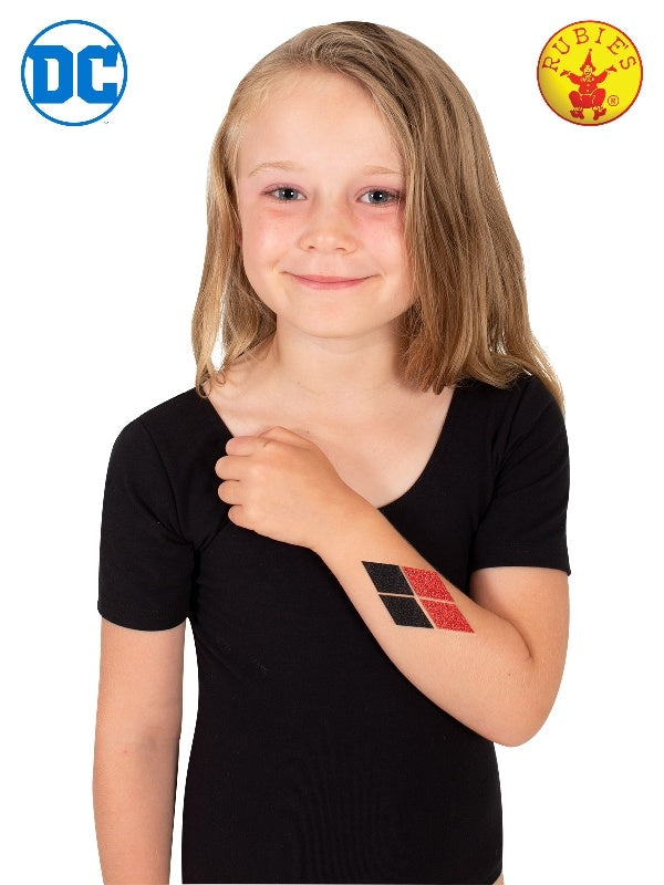 Once a talented, genius psychiatrist working in Arkham Asylum, Dr. Harleen Quinzel was tempted by the Joker's promises of love and riches if she joined him on the side of villainy, creating the wild, sassy, and fearsome supervillain known as Harley Quinn! These days, Harley doesn't need her Puddin' to tell her what to do anymore, but that doesn't mean she doesn't still love to cause some mischief and chaos! This awesome Harley Quinn Glitter Tattoo is based off of Harley's original look in Batman: The Animated Series, but it will be perfect for any iteration of the wacky supervillain! This tattoo is the classic black and red diamonds associated with Harlequins, in a fun, shimmering glitter!