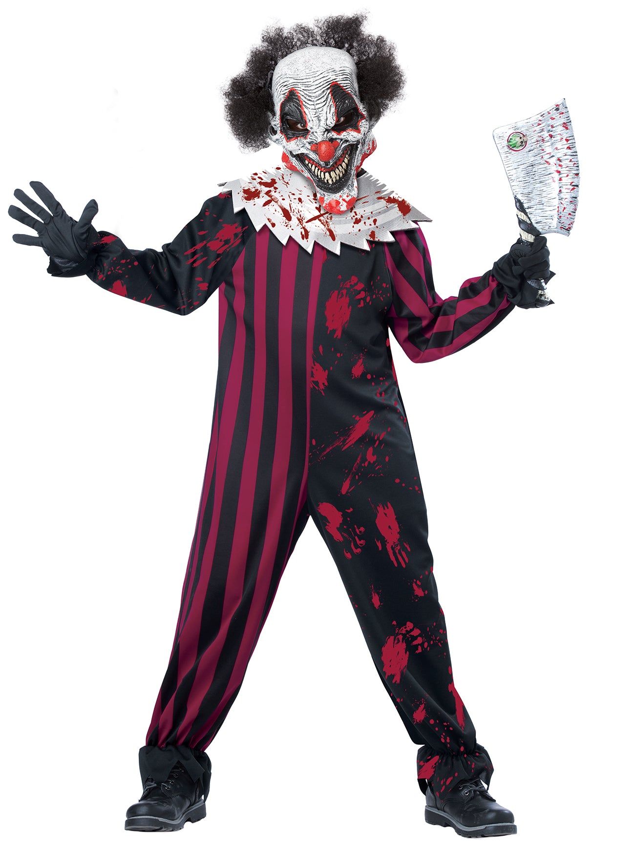 He's much more interested in knives than balloons. Killer Klown features a velcro jumpsuit with a metal saw, blood-covered designed collar. Also comes with clown mask with attached hair. Butcher knife, gloves, and shoes not included