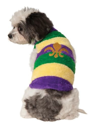 Mardi Gras is the best time of year to eat, drink, and be merry, so make your mutt feel like they're down on Bourbon Street in New Orleans with this adorable Mardi Gras Sweater from Rubie's Costumes! This adorable sweater is super soft and is striped in the classic gold, green, and purple with a gold Fleur de Lis on the back! This costume comes in sizes Small, Medium, Large, and Extra Large so it can fit all sorts of dog and cat breeds!