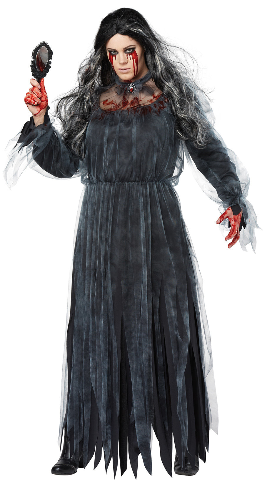To call her name one must pay the price. The Bloody Mary plus size costume is a long dress with a chiffon overlay. It comes with an attachable cameo and a foam mirror.
