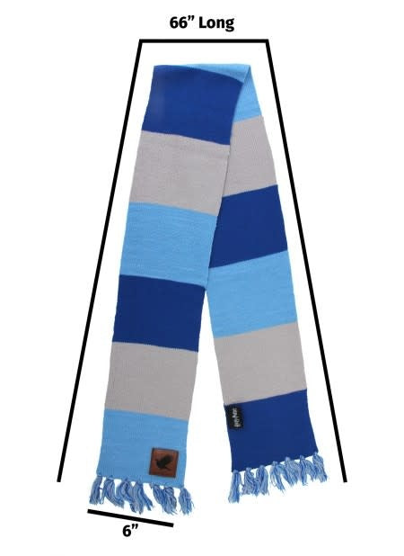 Bright and bold, this knit HARRY POTTER RAVENCLAW Patch Striped Scarf by elope will keep you toasty warm on blustery winter days. Inspired by the clever nature of Ravenclaw house, this scarf showcases color block styling in light blue, silver, and navy in addition to fringe detailing. To help you showcase your house pride, a faux-leather patch at the base of the scarf features the Ravenclaw eagle. Whether you're gifting a warm winter wearable to a WIZARDING WORLD fan, or starting a larger HARRY POTTER inspired cosplay, this Harry Potter Ravenclaw Patch Striped Scarf will bring a bit of magic into your everyday wardrobe.