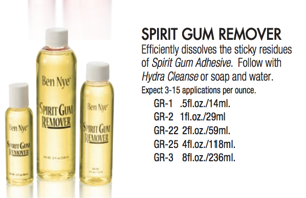Ben Nye Spirit Gum Remover will dissolve the sticky residue left over by Spirit Gum Adhesive when all is said and done. Run this remover over your skin with a cotton pad or wipe after removing your prosthetics for a simple and painless removal. Highly recommended for those taking on Spirit Gum or Pros-Aide because normal makeup removers may not remove all the residue. Follow with Ben Nye Hydra-Cleanse or soap and water to completely clear the skin of any leftover makeup and residue.