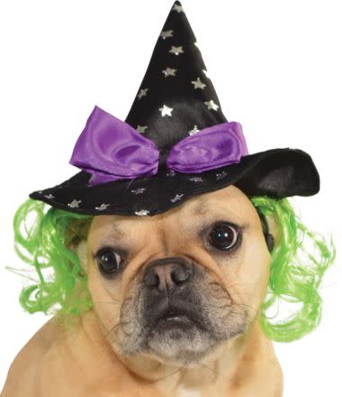 Halloween is all about becoming some of the creepy, spooky creatures of the night, so make sure your best furry friend can get in on it too with this adorable Witch Hat with attached hair from Rubie's Costumes! Whether the witch is casting spells, brewing potions, or flying through the sky on their broomstick, there's nothing that says Halloween more than a good, old fashioned witch! This adorable Pet Witch Hat is a pointed, black hat with a purple ribbons and decorated with silver stars, and has bright green, curly hair attached to the hat to sell the illusion that a witch is now sleeping at the foot of your bed!